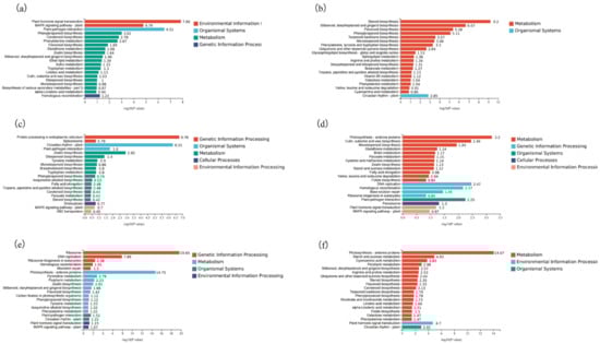 Figure 3. Kyoto encyclopaedia of genes and genomes (KEGG) pathways of differentially expressed genes (DEGs) from various comparisons. The KEGG pathways enriched by DEGs in the six groups of 0 h vs. 2 h (a), 0 h vs. 4 h (b), 0 h vs. 6 h (c), 0 h vs. 8 h (d), 0 h vs. 12 h (e), and 0 h vs. 24 h (f), respectively.