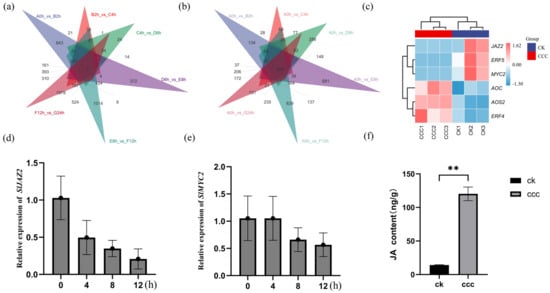 Figure 4. Venn diagram analysis of DEGs and the expression levels of MYC2, JAZ2, and the content JA in plants after CCC treatment. Venn diagram analysis of six periods (a,b); the cluster analysis (c). Gene expression levels of MYC2 (d) and JAZ2 (e) following CCC treatment; changes in JA content in tomato leaves after 4 h of CCC treatment (f). ** indicate significant differences between treatments (p < 0.05).