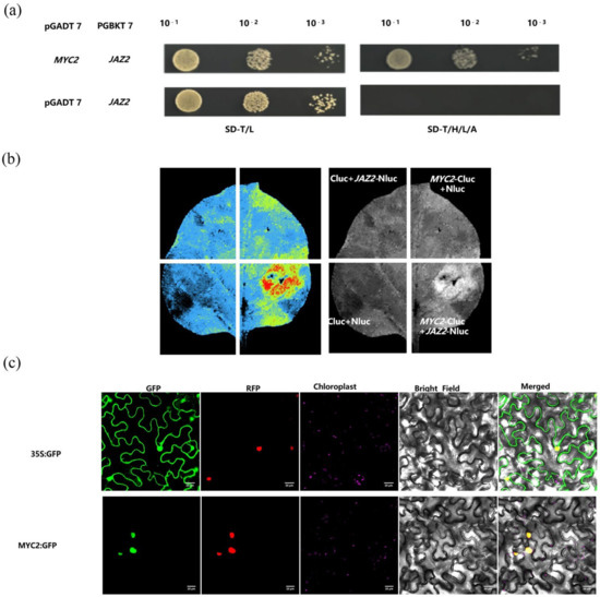 Figure 5. Verification of the interaction between MYC2 and JAZ2 and the subcellular localization of MYC2. Yeast two-hybrid (Y2H) and LUC assays confirmed the interaction between MYC2 and JAZ2 (a,b); Subcellular localization of MYC2 (c).