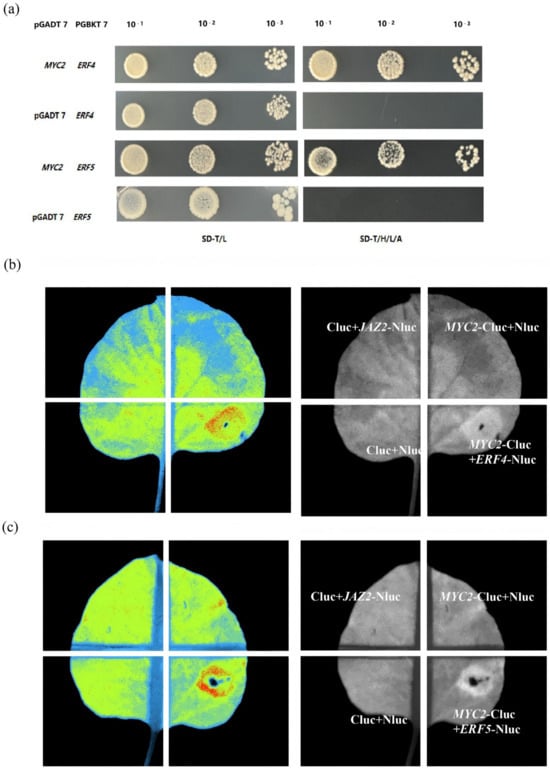 Figure 6. Validation of the interaction between MYC2 and ERF4, ERF5 through yeast two-hybrid assays (a) and luciferase complementation imaging (b,c).