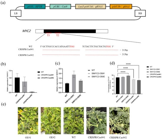 Figure 7. Transgenic validation of the relationship between MYC2 and TYLCD resistance in tomatoes. Schematic representation of the construction of the CRISPR/Cas9 vector and diagram of the knockout strains (a); expression levels of MYC2 in the knockout lines (b) and overexpression lines (c); detection of viral copy numbers in transgenic strains following pathogen inoculation (d); phenotypic comparison of transgenic lines inoculated with TYLCV (e). **** indicate significant differences between treatments (p < 0.05).