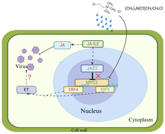 Figure 8. Molecular mechanism model of exogenous CCC-induced resistance to TYLCD in tomatoe. The red font indicates up-regulated expression genes, and the green font indicates down-regulated expression genes. “X” indicates that spraying CCC may break the inhibitory effect of JAZ2 on MYC2.