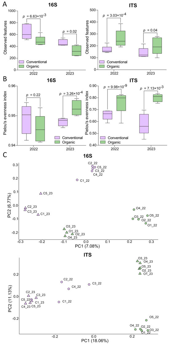 Variation in the composition of prokaryotic (16S) and fungal (ITS) communities in the conventional soil (CS) and the organic soil (OS) per year. (A) Alpha diversity measured as richness: total observations of sequenced samples. (B) Alpha diversity measured as evenness: Pielou’s index. (A,B) The boxplots include four to five independent biological replicates and p values according to the t-test and are indicated for all comparisons. (C) Beta diversity: PCoA from Jaccard’s distances. Dots: Year 2022. Triangles: Year 2023. The distances between the triangles and the dots represent the ecological distances between the samples.