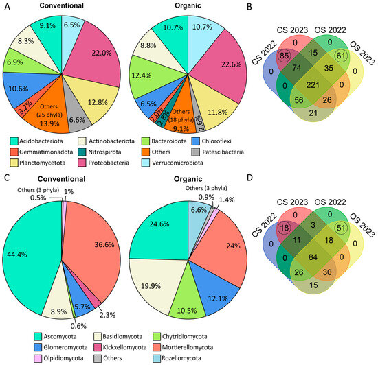 Microbial communities in conventional soil (CS) and organic soil (OS). (A) Doughnut plots illustrating bacterial phyla diversity. Phyla with less than 2% abundance are grouped under “Others”. (B) Farming distribution of the 594 common prokaryotic species in 2022 and 2023. Species exclusively observed in each soil (85 in CS and 61 in OS) are remarked. (C) Doughnut plots illustrating fungal phylum diversity. Phyla with less than 0.5% abundance are grouped under “Others”. (D) Farming distribution of the 256 common fungi species in 2022 and 2023. Species exclusively observed in each soil (18 in CS and 51 in OS) are remarked.
