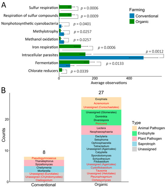 Fungal lifestyles are aligned more closely with sustainability and environmental friendliness in organic farming (endophytes and animal pathogens; see Figure 3). In addition, processes such as sulphur and iron respiration, chlorate reduction, and fermentation, which are crucial for plant health, are more prevalent in OS. These functional differences are also reflected in other studies showing that OS can enhance microbial metabolic activities related to nutrient cycling and plant health [48]. In contrast, CS had higher levels of intracellular parasites, including phytopathogenic bacteria, indicating potential risks to plant health.