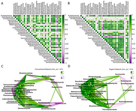 Phyla correlations and networks of the 33 phyla commonly detected in 2022 and 2023. Spearman correlation matrices in (A) conventional soil (CS) and (B) organic soil (OS). The size of the dot on the graph is directly proportional to the correlation numeric value. For more information on the statistics of the different correlation values, see Table S4. The networks for those 33 phyla in (C) CS and (D) OS. The intensity of the line is directly proportional to the absolute value of the interaction. Only interactions with a coefficient greater than 0.5 are shown.