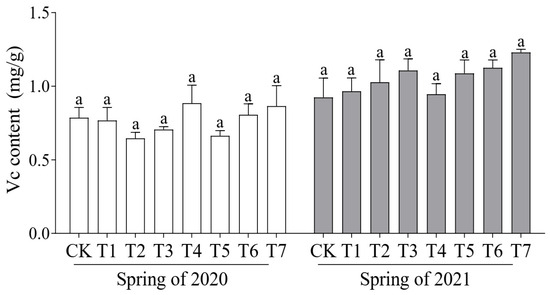 Soluble protein and vitamin C (Vc) are key indicators of the nutritional quality of cucumber fruit; therefore, their content was measured across the different treatments. In the spring crop of 2020, the soluble protein content of all treatments was lower than that of the control, with the highest level observed in the T2 treatment (6.08 mg/g). The highest Vc content (0.88 mg/g) was recorded in the T4 treatment (Figure 1). In the spring crop of 2021, T4 exhibited the highest soluble protein content (5.15 mg/g), while the Vc content was higher than that of the control across all treatment groups, with T7 exhibiting the highest Vc content of 1.23 mg/g (Figure 2).