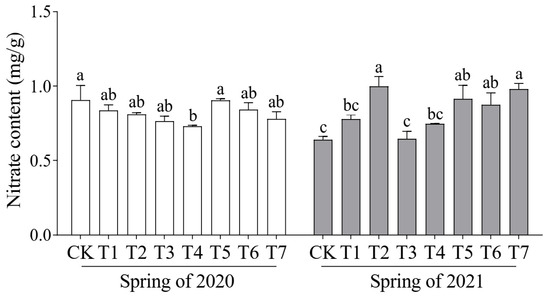Although nitrate is not an essential nutrient for humans, its excessive intake may pose health risks. Therefore, monitoring nitrate content is critical as a quality control parameter in vegetable production. In the spring crop of 2020, T4 had the lowest nitrate content among all treatments (0.73 mg/g) (Figure 3). In the spring crop of 2021, the nitrate content across treatments ranged from 1.05% to 56.34% higher than the control, with the lowest level recorded in the T3 treatment (0.64 mg/g), which was different from those of the other treatments and the control. Overall, the T4 treatment increased the Vc content by 12.52% in 2020 and 2.4% in 2021 compared to the control, while maintaining a relatively low nitrate content. These findings suggest that a moderate increase in mushroom residue can enhance Vc accumulation and improve the overall nutritional quality of cucumber fruit.