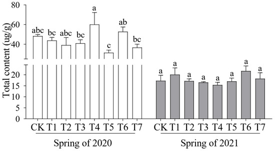 The different composite substrates led to significant variations in total aroma content. In the spring crop of 2020, the T4 treatment exhibited the highest total aroma content (60.05 μg/g). However, in the spring crop of 2021, no significant differences were observed among treatments, with the highest aroma content recorded in the T6 treatment (21.69 μg/g) (Figure 4).