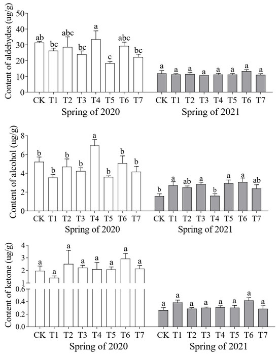 The composition of aromatic compounds in cucumber fruit across treatments was largely similar, with aldehydes being the predominant volatiles, accounting for 55.5% to 65.02% of the total aroma content (Figure 5). Significant differences were observed in the content of individual aroma compounds. In 2020, the highest aldehyde content was found in the T4 treatment (33.45 μg/g), which was higher than that of the control, followed by the T6 treatment (29.28 μg/g). In 2021, the highest aldehyde content was recorded in the T6 treatment.
