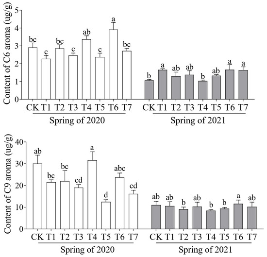 C6 and C9 aldehydes are the key contributors to the characteristic aldehydic aroma of cucumber, and play a crucial role in its flavor profile. In the spring crop of 2020, the highest C6 aldehyde content (3.92 μg/g) was observed in the T6 treatment, while the highest C9 aldehyde content (31.54 μg/g) was found in the T4 treatment (Figure 6). In 2021, both C6 and C9 aldehydes reached their highest levels in the T6 treatment.