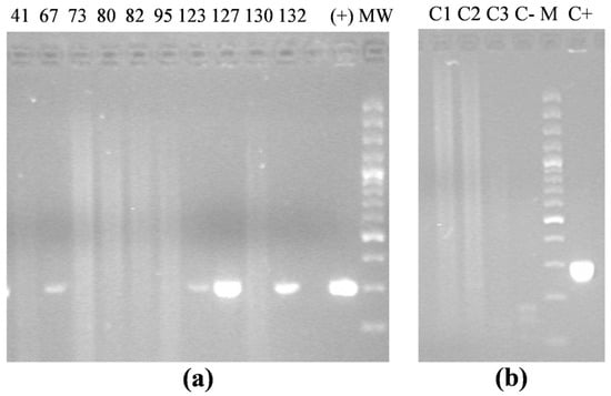 Direct PCR on leaf tissue from transformed (a) and control (b) A. oleracea plants with primers for A. rhizogenes rolC gene. +—positive control (rolC gene cloned in pUC18 plasmid); MW—molecular weight marker (GeneRuler 100 bp Plus DNA ladder, Thermo Scientific).