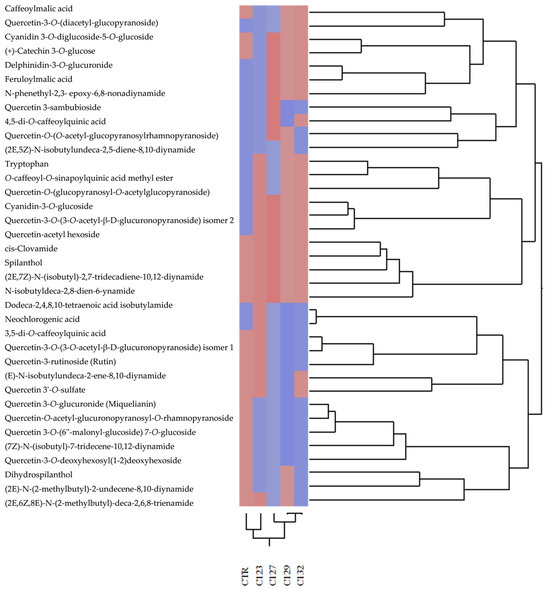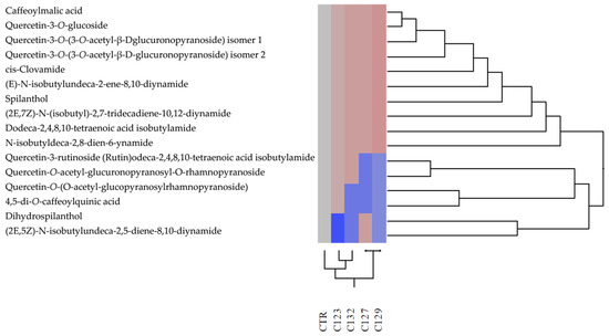 Hierarchical clustering analysis of the phytochemical profiles detected in hydroalcoholic root extracts of transgenic (C123, C127, C129, and C132) and non−transgenic (CTR) A. oleracea plants. Different colors represent the degree of similarity among samples, with similar colors indicating closer phytochemical profiles and distinct colors highlighting greater differences.