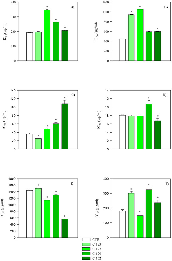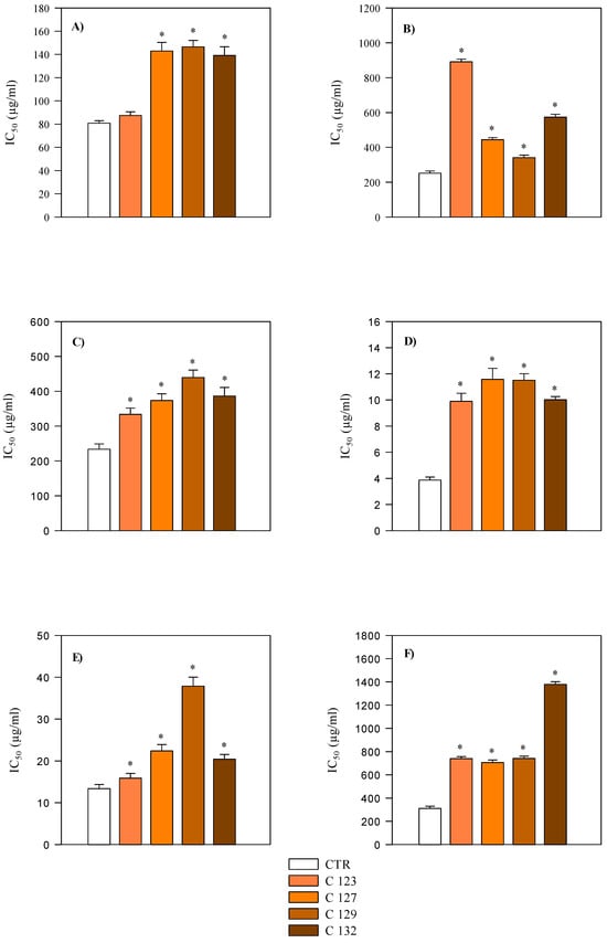 Comparison of antioxidant activity of hydroalcoholic extracts of transgenic (C123, C127, C129, and C132) and non−transgenic (CTR) A. oleracea roots. Results are expressed as IC50 and represent the mean ± standard deviation of three independent experiments in triplicate (n = 3). (A) FRAP; (B) DPPH; (C) TEAC; (D) ORAC; (E) β-Carotene bleaching; (F) Iron-chelating activity. * p < 0.001 vs. CTR.