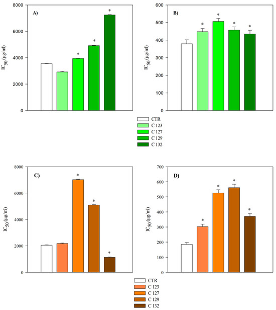 Comparison of the anti−inflammatory activity of hydroalcoholic extracts of aerial parts (A,B) and roots (C,D) of transgenic (C123, C127, C129, and C132) and non−transgenic (CTR) A. oleracea plants. Results are expressed as IC50 and represent the mean ± standard deviation of three independent experiments in triplicate (n = 3). Heat-induced BSA denaturation assay (A,C); Protease inhibition assay (B,D). * p < 0.001 vs. CTR.