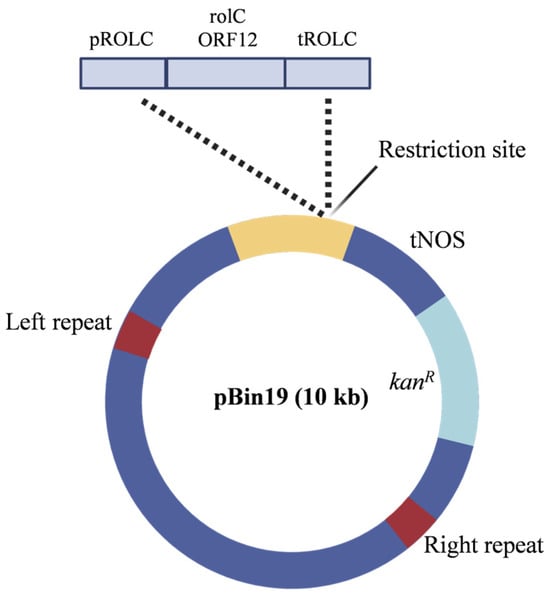 Binary vector Bin19 containing the HindIII-EcoRI fragment (1860 bp) from A. rhizogenes 1855, corresponding to the natural promoter (pROLC), the coding sequence (rolC—ORF12) and the terminator region (tROLC) for the rolC gene conjugated into A. tumefaciens LBA4404 strain. kanR—kanamycin resistance gene; pNOS—nopaline synthase gene promoter; tNOS—nopaline synthase gene terminator.