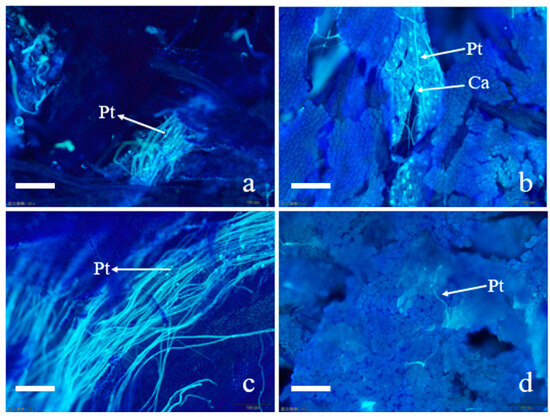 Pollen grain germination and pollen tube growth after self-pollination and cross-pollination of Paeonia ostii ‘Fengdanbai’. (a) Pollen tubes in self-crossed stigma at 12 h after pollination; (b) pollen tubes in hybrid stigma at 12 h after pollination; (c) pollen tube in self-crossed stigma at 24 h after pollination; (d) pollen tubes in hybrid stigma at 12 h after pollination. pt: pollen tube; Ca: callose, bar = 100 μm.