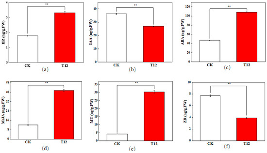 As can be seen in Figure 2, the contents of zeatin riboside (ZR) and indole-3-acetic acid (IAA) in hybrid stigmas are significantly lower than those of the CK. Meanwhile, the contents of abscisic acid (ABA), brassinosteroid (BR), methyl jasmonate (MeJA), and melatonin (MT) are significantly higher than those of the CK at 12 h after pollination.
