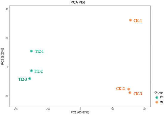 LC-MS/MS was employed to analyze the metabolite composition of peony stigma 12 h post-pollination in the T12 and CK groups. As shown in Figure 3, the six samples were divided into two different groups using PCA (Principal Component Analysis). The differences between T12 and CK were mainly explained by PC1 and PC2 in the model, which accounted for 65.87% and 9.25% of the variables, respectively. This experiment performed univariate and multivariate statistical methods to identify difference metabolites (VIP > 1, |log2FC| ≥ 1, and p < 0.05) between T12 and CK. At 12 h after pollination, T12 and CK had 1242 divergent metabolites, of which 433 were up-regulated and 809 down-regulated.