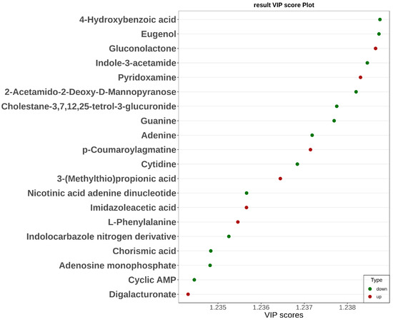 Graph of VIP values of differential metabolites in the KEGG pathway. The horizontal coordinate shows the VIP values; the vertical coordinate shows the differential metabolites; red denotes up-regulated differential metabolites and green denotes down-regulated differential metabolites.