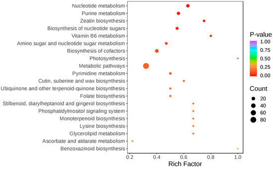 Metabolic pathway analysis (Figure 5) showed that cross-pollination significantly altered the metabolic pathways of nucleotide metabolism, purine metabolism, zeatin biosynthesis, nucleotide sugar biosynthesis, amino acid sugar and nucleotide sugar metabolism, and cofactor biosynthesis in the stigma.