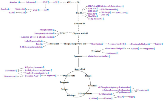 Effect of cross-pollination on stigma metabolic pathways. Metabolites identified in purple text are differential metabolites, up and down direction of blue arrows indicate up-regulation or down-regulation, respectively, of metabolites in T12 compared to CK, and solid and dashed lines connecting the arrows indicate a direct response or an indirect response, respectively.