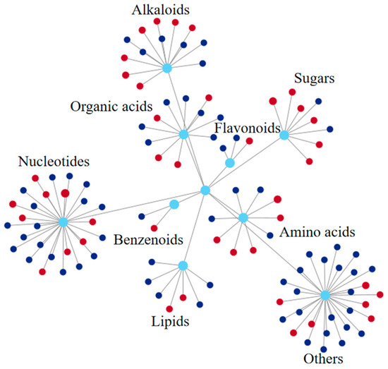 Comprehensive functional/pathway network diagram of differential metabolites in the stigma KEGG pathway. Each node in the figure represents a KEGG pathway-annotated differential metabolite. The diameter of the circles is proportional to the fold change (FC) value. Red color indicates a positive log2FC value, dark blue indicates a negative log2FC value, and light blue indicates metabolite classification.