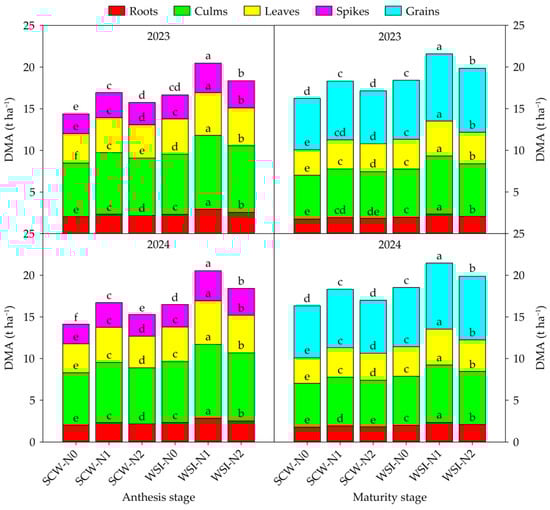 The planting pattern and nitrogen application rate had a significant effect on the DMA of each organ in both stages and both years. The interaction between planting pattern and nitrogen application rate had a significant effect on the DMA, except for the spikes at the anthesis stage and leaves and grains at the maturity stage in 2023 (Table S1). Across years and treatments, the order of DMA among organs was culms > leaves > spikes > roots at the anthesis stage and grains > culms > leaves > roots at the maturity stage, respectively (Figure 1). In both stages and both years, the DMA of each organ under the WSI treatment was higher than that under the SCW treatment. In addition, the DMA of each organ increased with the increase in nitrogen application rate from N0 to N1, while the DMA decreased with the increase in nitrogen application rate from N1 to N2.