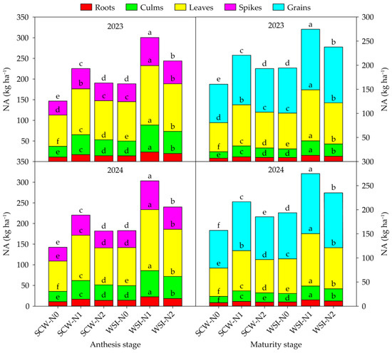 The planting pattern, nitrogen application rate, and their interaction had significant effect on the NA of each organ in both stages and both years (Table S2). Across years and treatments, the NA among organs was in the order of leaves > spikes > culms > roots at the anthesis stage and grains > leaves > culms > roots at the maturity stage, respectively (Figure 2). In both stages and both years, the NA of each organ under the WSI treatment was higher than that under the SCW treatment. Moreover, the NA of each organ increased with the increase in the nitrogen application rate from N0 to N1, while decreased with the increase in the nitrogen application rate from N1 to N2.