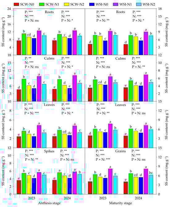 Effects of planting pattern and nitrogen application rate on the soluble sugar (SS) content in waxy sorghum. Data are the mean of three replicates and different lowercase letters within an organ in the same growth stage and year indicate significant differences among treatments at the 0.05 level. SCW: Sole cropped waxy sorghum; WSI: Waxy sorghum intercropped with soybean; N0: Zero nitrogen; N1: Medium nitrogen; N2: High nitrogen; P: Planting pattern; N: Nitrogen application rate; P × N: Interaction between planting pattern and nitrogen application rate. ns, *, **, and *** indicate not significant and significant at the 0.05, 0.01, and 0.001 levels, respectively.
