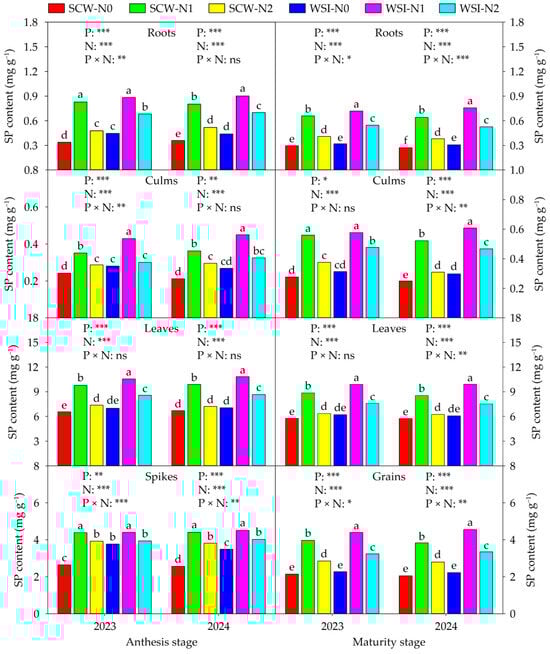 Effects of planting pattern and nitrogen application rate on the soluble protein (SP) content in waxy sorghum. Data are the mean of three replicates and different lowercase letters within an organ in the same growth stage and year indicate significant differences among treatments at the 0.05 level. SCW: Sole cropped waxy sorghum; WSI: Waxy sorghum intercropped with soybean; N0: Zero nitrogen; N1: Medium nitrogen; N2: High nitrogen; P: Planting pattern; N: Nitrogen application rate; P × N: Interaction between planting pattern and nitrogen application rate. ns, *, **, and *** indicate not significant and significant at the 0.05, 0.01, and 0.001 levels, respectively.