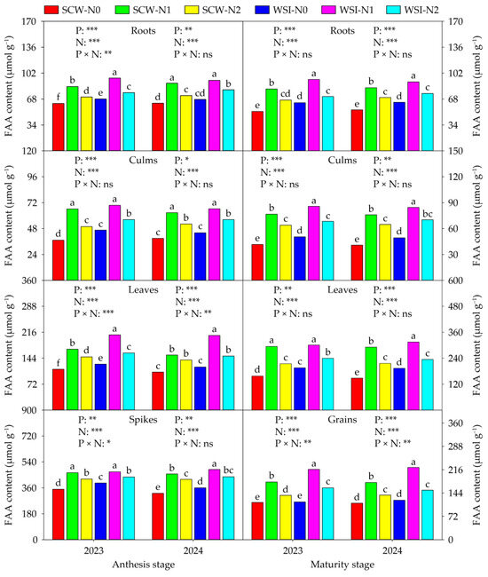 The SS (Figure 3), SP (Figure 4), and FAA (Figure 5) contents of each organ were significantly affected by planting pattern and nitrogen application rate in both stages and both years, and also affected by interaction between planting pattern and nitrogen application rate. Across years and treatments, at the anthesis stage, the orders of SS, SP, and FAA contents among organs were roots > culms > spikes > leaves, leaves > spikes > roots > culms, and spikes > leaves > roots > culms, respectively. At the maturity stage, the SS content among organs was in the sequence of roots > grains > leaves > culms, and the SP and FAA contents among organs were in the order of leaves > grains > roots > culms in both years and all treatments. In addition, in both stages and both years, the SS, SP, and FAA contents of each organ among planting patterns and nitrogen application rates were in the sequence of WSI > SCW and N1 > N2 > N0, respectively.