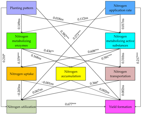 As shown in Figure 6, planting pattern and nitrogen application rate had significant and direct positive effects on nitrogen utilization and yield formation. Nitrogen metabolizing enzymes had significant and direct positive effects on nitrogen uptake and nitrogen transportation. Nitrogen metabolizing active substances had significant and direct positive effects on nitrogen uptake and nitrogen accumulation. Nitrogen transportation had a significant and direct positive effect on nitrogen utilization, and nitrogen utilization had a significant and direct positive effect on yield formation.