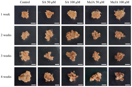 Callus of Abeliophyllum distichum by concentration of SA and MeJA treatment in Petri dishes. SA and MeJA were applied at concentrations of 50, 100 µM, and callus growth was monitored weekly over a 4-week cultivation period. Bars represent 1 cm.