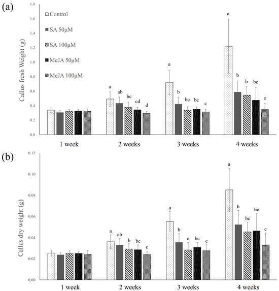 (a) Fresh weight and (b) dry weight of Abeliophyllum distichum callus by concentration of SA and MeJA treatment in Petri dishes. SA and MeJA were applied at concentrations of 50, 100 µM, and callus growth was monitored weekly over a 4-week cultivation period. Different letters above the columns indicate a significant difference (p < 0.05), and error bars indicate ± SD.