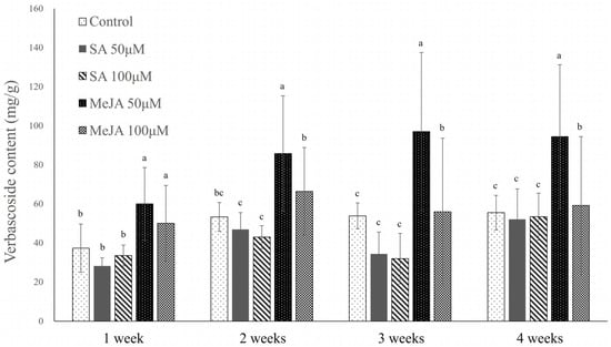 We detected a statistically significant difference among the assessed treatments with respect to the verbascoside contents of callus (Figure 3). After 4 weeks of cultivation, the highest verbascoside content of 94.39 ± 36.82 mg/g of dry callus was recorded in the 50 μM MeJA-elicited callus (Figures S1–S5). Moreover, the levels in callus were consistently the highest throughout the period of cultivation. Whereas lower levels were obtained in the 100 μM MeJA-elicited callus, these were still higher than those detected in callus treated with 50 and 100 μM SA, which were even lower than the contents of verbascoside in the control callus.
