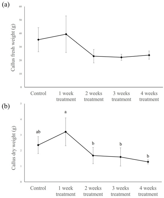 The highest fresh weight of the callus (approx. 39.43 ± 9.00 g) was obtained following treatment with MeJA for 1 week, whereas weights of approximately 23.07 ± 5.00, 22.24 ± 2.25, and 23.86 ± 3.07 g were recorded following treatments for 2, 3, and 4 weeks, respectively, which were all lower than the 35.32 ± 9.00 g of control callus, although the differences were not statistically significant (Figure 5).