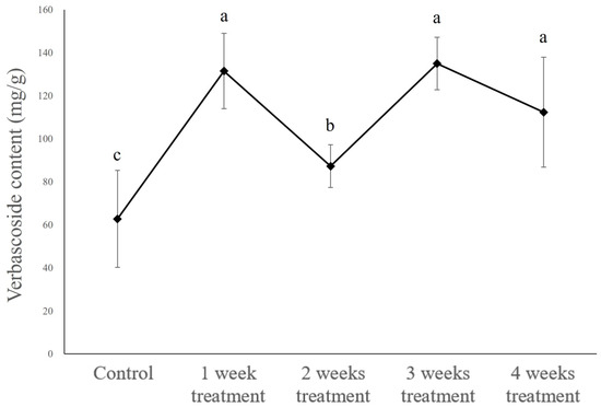 Verbascoside content of Abeliophyllum distichum callus by period of 50μM MeJA treatment in bioreactor. MeJA was applied for 1, 2, 3, or 4 weeks, and the measurements were taken after 4 weeks of cultivation. Different letters above the columns indicate a significant difference (p < 0.05), and error bars indicate ± SD.