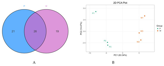 (A) A Venn diagram was constructed to illustrate the overlapping and unique features between the two comparison sets. (B) The metabolome data were put through principal component analysis (PCA). A PCA map has an x-axis that shows principal component 1 (PC1) and a y-axis that shows principal component 2 (PC2). (C) An analysis of differentially accumulated anthocyanins across the three experimental groups was carried out.