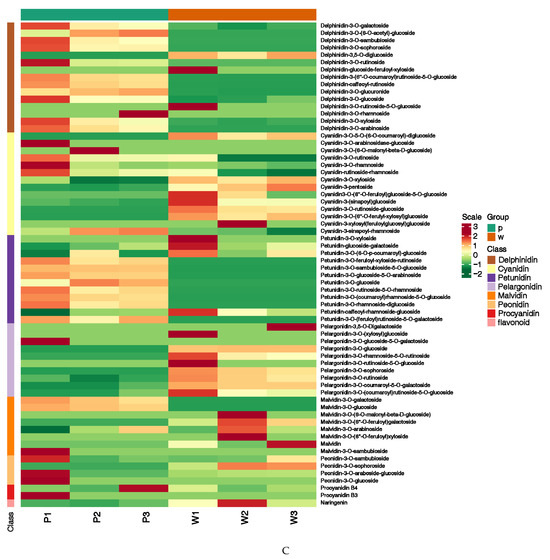 Anthocyanin-targeted metabolism identified 44 differentially accumulated DEMs (Differentially Expressed Metabolites), which could be classified into 8 major categories, namely petunidin (10), delphinidin (11), flavonoid (1), malvidin (4), peonidin (1), cyanidin (11), and pelargonidin (6). There were 26 of the same anthocyanins in purple and white flowers (Figure 2B). Approximately 24 DEMs showed increased abundance in purple petals, while 20 showed decreased abundance. The proportion of highly abundant petunidin and delphinidin was significantly higher in purple petals than that of low-abundant counterparts in white petals, suggesting their key roles in petal coloration.