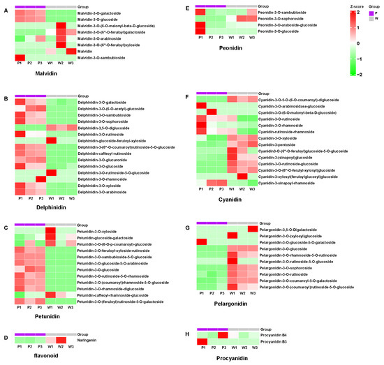 DAE Heatmap of Six Anthocyanins in Purple and White Petals. P1, P2, P3, W1, W2, and W3 represent three replicates of purple flowers and white flowers, respectively. Malvidin (A), Delphinidin (B), Petunidin (C), flavonoid (D), Peonidin (E), Cyanidin (F), Pelargonidin (G), and Procyannidin (H) in Purple Petals vs White Petals.