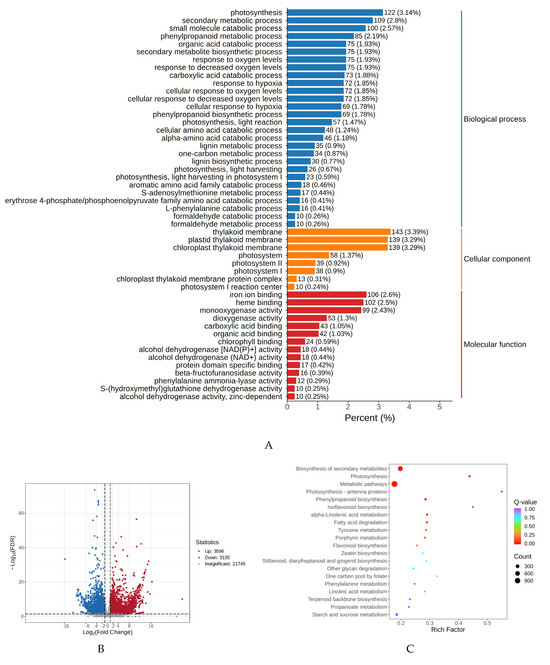 The transcriptome analysis was conducted on six samples. In total, 46.1 GB of high-quality data were acquired, with each high-quality data sample attaining 6 GB. The proportion of Q30 bases was 91% or more. These transcriptome data indicate that the RNA-seq dataset is reliable for further research. All differentially expressed genes (DEGs) were mapped to the Gene Ontology (GO) database and then further categorized into three main categories: cellular components, molecular functions, and biological processes. (Figure 4A). In the cellular component category, most of the enrichments were observed in the “cellular process” and “metabolic process”. In the biological process category, the majority of DEGs were mapped to “cellular anatomical entity”. As for molecular functions, most DEGs were mapped to “binding” and “catalytic activity”. Regarding the Kyoto Encyclopedia of Genes and Genomes (KEGG) annotation results, 6731 DEGs from all samples were mapped to 138 KEGG pathways. The volcano plot analysis revealed that when comparing purple petals with white petals, a total of 6731 differentially expressed genes were identified. Among these genes, 3596 DEGs showed higher expression levels in purple petals, while 3135 DEGs exhibited lower expression levels in purple petals relative to white petals (Figure 4B). Many DEGs were enriched in pathways associated with anthocyanin accumulation, such as “Flavonoid biosynthesis” (Figure 4C).