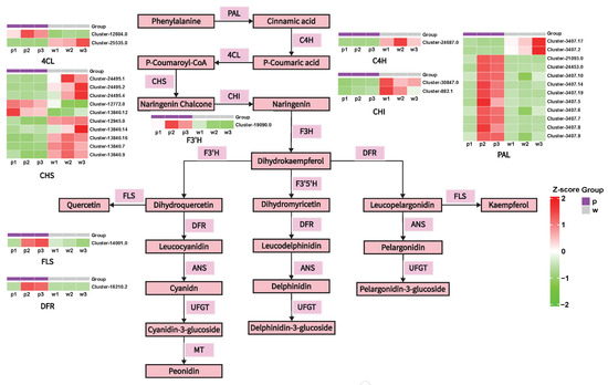 To delve into the accumulation of flavonoids in the leaves of Iris dichotoma in more detail, we investigated the gene expression patterns within the flavonoid pathway. Based on the transcriptome results, to gain a more profound comprehension of the fundamental mechanisms governing anthocyanin synthesis, we established the anthocyanin synthesis pathway. A total of 36 structural genes associated with anthocyanin biosynthesis were identified through screening, including PAL (12), CHS (10), ANR (5), 4CL (2), CHI (2), C4H (1), DFR (1), F3′H (1), and FLS (1). These genes demonstrated notable disparities in expression between purple-flowered and white-flowered plants. Specifically, the expression levels of 10 PAL genes (Cluster-21,093.0, log2FoldChange = 3.22; Cluster-24,453.0, log2FoldChange = 2.54; Cluster-3407.10, log2FoldChange = 1.62; Cluster-3407.14, log2FoldChange = 2.39; Cluster-3407.19, log2FoldChange = 2.48; Cluster-3407.5, log2FoldChange = 2.04; Cluster-3407.6, log2FoldChange = 1.77; Cluster-3407.7, log2FoldChange = 2.4; Cluster-3407.8, log2FoldChange = 2.28; Cluster-3407.9, log2FoldChange = 1.79), 2 CHS genes (Cluster-12,772.0, log2FoldChange = 2.57; Cluster-13,840.12, log2FoldChange = 2.95), 1 ANR gene (Cluster-7415.6, log2FoldChange = 3.74), 1 4CL gene (Cluster-12,604.0, log2FoldChange = 2.29), 1 DFR gene (Cluster-16,210.2, log2FoldChange = 9.67), 1 F3′H gene (Cluster-19,090.0, log2FoldChange = 2.67), and 1 FLS gene (Cluster-14,001.0, log2FoldChange = 2.46) were higher in purple-flowered plants compared to white-flowered ones.