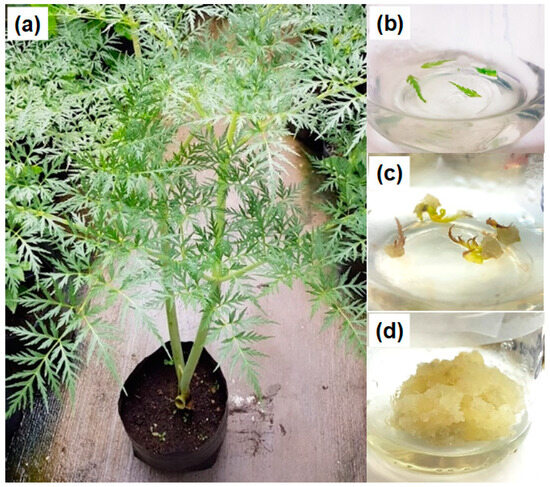 Specimen identification was carried out by Dr. Daniel Sánchez Carbajal and Dr. Pablo Carrillo Reyes of the Laboratorio Nacional de Identificación y Caracterización Vegetal (Laniveg-Conacyt) and the “Luz María Villareal de Puga” Herbarium (IBUG), Instituto de Botánica, Universidad de Guadalajara. The plant was identified as Prionosciadium dissectum J.M. Coult. & Rose (Apiaceae), and a sample was deposited in the herbarium with the registration number 209558. Another sample was collected and immediately transplanted into a pot containing substrate from the collection site and was maintained outdoors in the back garden (Figure 1a). The plant grew successfully; this was then used as a resource for leaf explants for callus induction experiments.