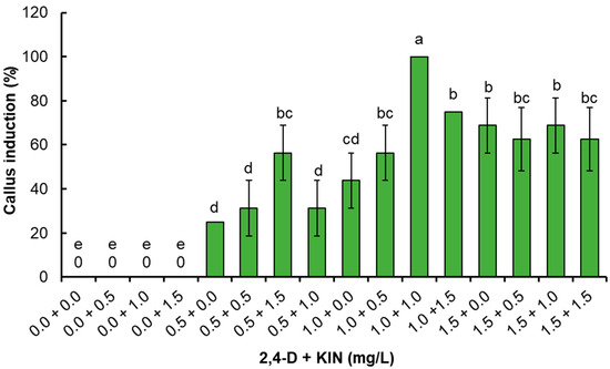 Effect of 2,4-D and KIN on the percentage of callus induction in leaf explants of P. dissectum. Tukey’s honest significance test. Columns with the same letter are not significantly different (p ≤ 0.05).