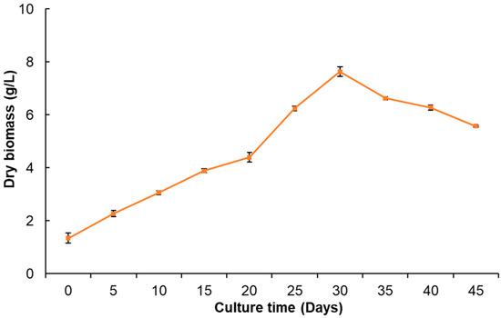 The growth kinetics of P. dissectum calluses (Figure 3) showed slow and constant growth until day 15; subsequently, a slight decrease was observed on day 20. Then, exponential growth was displayed until day 30, during which 7.6 g/L dry biomass was obtained as the maximum yield. The stationary phase was not observed since, after day 30, the callus had a sudden decrease in growth (death phase) until day 45, and the appearance of the callus turned brown. In a previous study on Angelica sinensis, it was reported that of the growth kinetic parameters of calluses cultured in four different media, Gambor (B5) and Schenk and Hildebrandt (HS), were superior to MS or White medium, using 2,4-D and BA [29]. In the callus culture of Cnidium officinale, the highest fresh weight of biomass was also reported after 30 days of culture when 2,4-D and BA were used as plant growth regulators [30].