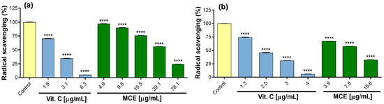 Hydroxyl radical scavenging activity of methanol callus extract (MCE). (a) DPPH test; (b) ABTS test. The significant difference was determined using an ANOVA followed by a Dunnett’s test. Vitamin C (Vit. C) and MCE compared with the control (**** p ˂ 0.0001).