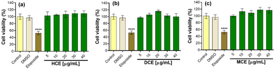 Effect of callus extracts on cell viability of RAW 264.7 macrophages. Values represent mean ± standard deviation of three independent experiments (n = 3). The significant difference was determined using an ANOVA followed by a Dunnett’s test. DMSO, ETOP (etoposide), and extracts compared with the control group (**** p < 0.0001). Control = cells without treatment, defined as 100% viability. (a) HCE = hexane callus extract; (b) DCE = dichloromethane callus extract; (c) MCE = methanol callus extract.