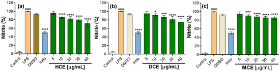 Effect of callus extracts on nitric oxide (NO) production in RAW 264.7 macrophages stimulated with LPS. Values represent the mean ± SD of three independent experiments (n = 3). The significant difference was determined using an ANOVA followed by a Dunnett’s test. LPS compared to the control group (#### p < 0.0001); DMSO (dimethylsulfoxide), INDO (indomethacin), and extracts compared with the LPS group (* p < 0.05, *** p < 0.001, and **** p < 0.0001). Control = cells without stimulation. (a) HCE = hexane callus extract, (b) DCE = dichloromethane callus extract, (c) MCE = methanolic callus extract.