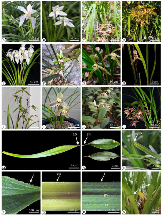 Plants of twelve Cymbidium species, showing their flower, leaf morphology and detailed leaf features. (A–L) Flower and leaf of twelve Cymbidium species; (M–S) detailed leaf features; (A–E) subgen. Cyperorchis; (F–K) subgen. Jensoa; (L) subgen. Cymbidium. (A) C. eburneum; (B) C. mastersii; (C) C. hookerianum; (D) C. tracyanum; (E) C. wenshanense; (F) C. qiubeiense; (G) C. faberi; (H) C. defoliatum; (I) C. kanran; (J) C. serratum; (K) C. lancifolium; (L) C. floribundum; (M) Lorate leaf of (L) C. floribundum with slightly oblique apex (enlarged image); (N) oblanceolate–oblong leaf; (O) leaf apex and two-lobed leaf; (P) leaf of (N) C. lancifolium (enlarged image) with apex margin and finely toothed margin; (Q) entire leaf margin entire of (J) C. defoliatum (enlarged image); (R) toothed leaf margin of (H) C. faberi (enlarged image); (S) articulate leaf of (C) C. hookerianum (enlarged image). ap, apex; pe, petioles; lo, lobed; t, toothed; en, entire; pv, primary veins; sv, secondary veins; ar, articulate.